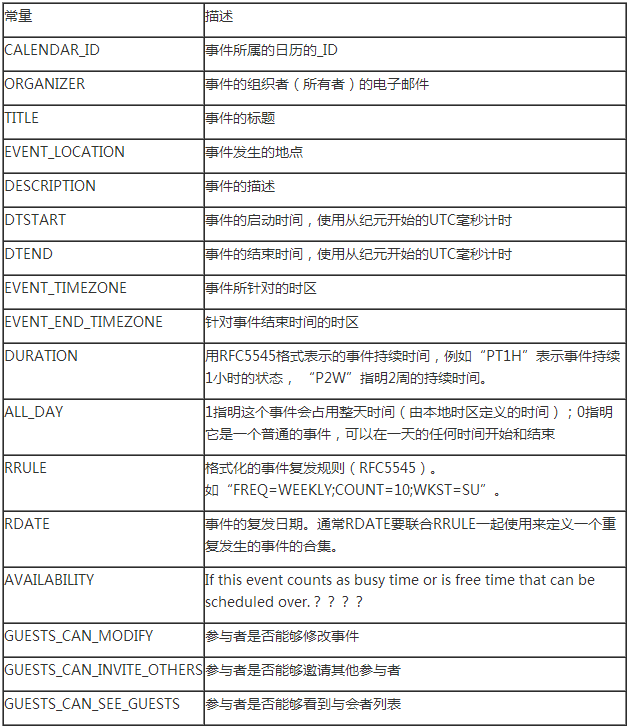 1. 挿入、更新、およびカレンダーのイベントを表示する:直接カレンダーからは、挿入、変更、およびイベントを読み取るを提供するには、適切な権限が必要です。完全なカレンダーアプリケーションまたは同期アダプターを作成しない場合は、これらのアクセス許可を適用する必要はない。あなたはそれらを置き換えるために読み取りおよび書き込み操作をオブジェクトがサポートするAndroidのインテントからのカレンダーアプリケーションを使用することができます。あなたはIntentオブジェクトを使用すると、アプリケーションは、カレンダーアプリケーションにユーザーを送り、それが所望の動作を実行させるために、フォームを事前に記入します。実行が完了すると、アプリケーションに返されます。カレンダが相互運用可能なアプリケーションの設計を介して行うことができ、それは、一貫性のある強力なユーザーインターフェースをユーザーに提供することができる。これは、詳細については、お勧めの方法です "と、ルックカレンダーIntentオブジェクト"を参照してください。