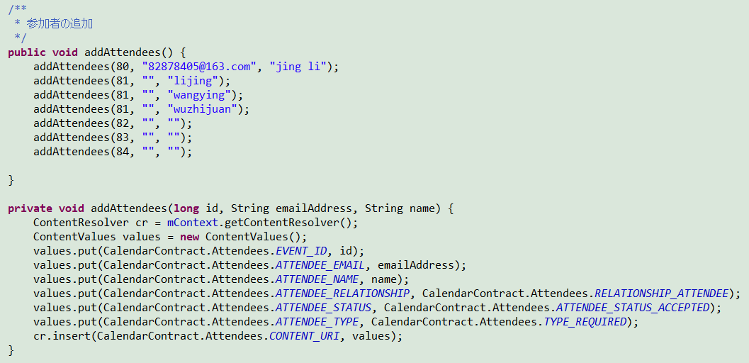 表の各行は、単一のイベントの参加者を表しますCalendarContract.Attendees。指定されたクエリ()参加者のイベントリストに対応するメソッドを呼び出しEVENT_ID。 EVENT_IDは、特別なイベントの試合が続かなければなりません。
