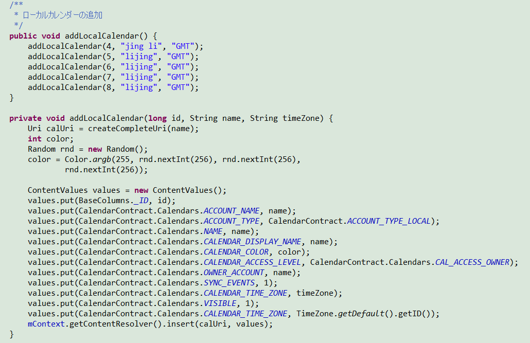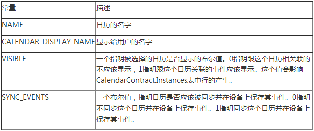 2. 同期アダプタ。別のサーバーまたはデータソースの同期を持つユーザデバイス上のカレンダーデータへのアダプタを同期。 CalendarContract.CalendarsとCanlendarContract.Eventsテーブルで、いくつかは、同期アダプタを使用する列のために予約されています。彼らは同期アダプタが表示されている場合は、アクセスされるまで、提供およびアプリケーションは、それらを変更しないでください。同期アダプタの詳細については、 "同期アダプタ"を参照してください