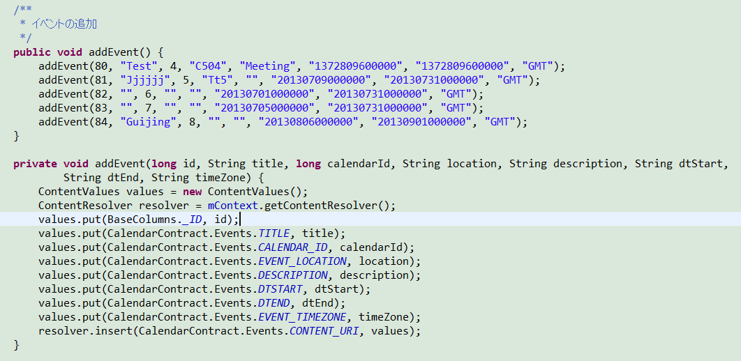 CalendarContract.Eventsテーブルは、単一のイベントの詳細が含まれています。イベントを追加、更新、または削除するには、アプリケーションはWRITE_CALENDAR権限が含まれている、そのマニフェストファイルでなければなりません。