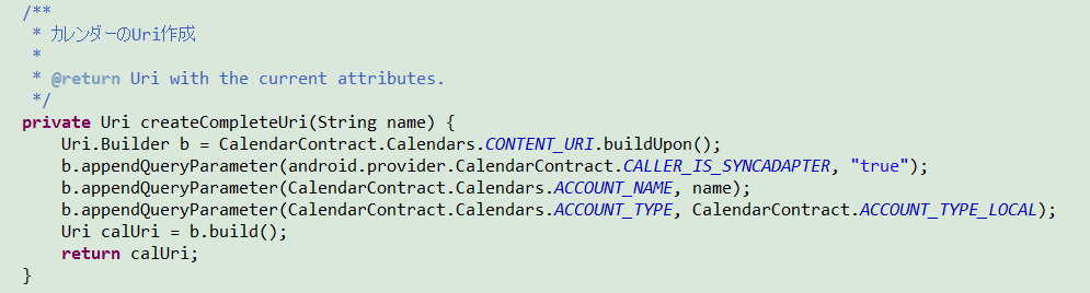 CalendarContractクラスは、カレンダー事象に関連した情報のデータモデルを定義する。このデータは、以下に示す複数のテーブルに格納される。